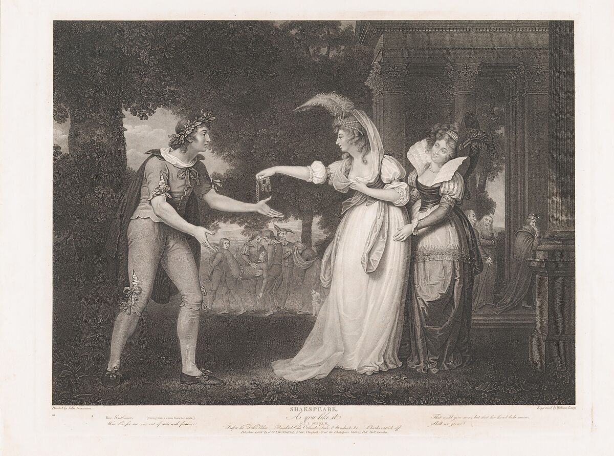 Smirke's image centers on Rosalind's first encounter with Orlando in As You Like It. The image was conceived for John Boydell's Shakespeare Gallery, launched in 1786 as a publishing-cum-exhibition scheme that included a new illustrated edition of the plays, sets of large and small engravings, and a gallery on London's Pall Mall. The latter opened in 1789 with thirty-four paintings and contained about one hundred and seventy works the time Boydell went bankrupt and auctioned the contents in 1805–his print sales plummeted when Napoleon blocaded European ports. This print belongs to an American reissue of 1852 spearheaded by Shearjashub Spooner, a New York dental surgeon, writer and art scholar who acquired Boydell's heavily worn plates and had them reworked. Printed on thick cream colored paper, the New York edition added small numbers in the lower left margin, this being number 26.