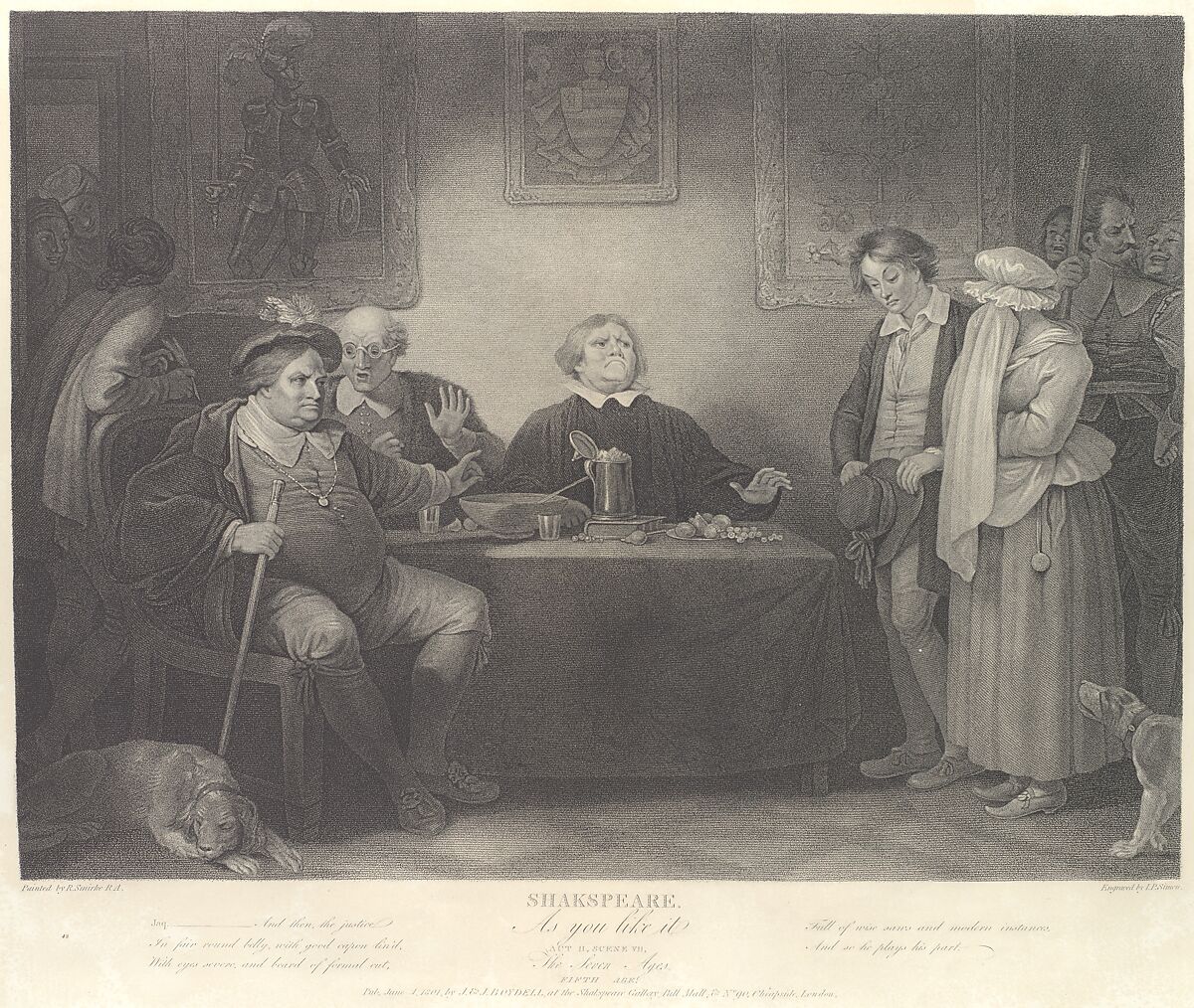 Smirke's image responds to a poetic description of life's stages in As You Like It and represents a mature justice. the image was conceived for John Boydell's Shakespeare Gallery, launched in 1786 as a publishing-cum-exhibition scheme that included a new illustrated edition of the plays, sets of large and small engravings, and a gallery on London's Pall Mall. The latter opened in 1789 with thirty-four paintings and contained about one hundred and seventy works the time Boydell went bankrupt and auctioned the contents in 1805–his print sales plummeted when Napoleon blocaded European ports. This impression belongs to an American reissue of 1852 spearheaded by Shearjashub Spooner, a New York dental surgeon and art scholar who acquired Boydell's heavily worn plates and had them reworked. Printed on thick cream colored paper, the New York edition added small numbers in the lower left margin, this being number 43.