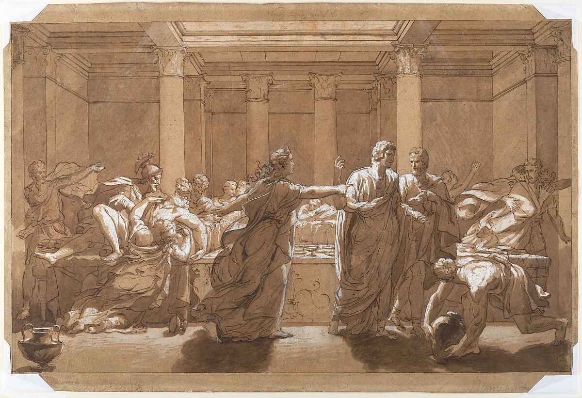 This is the only known full composition study for Abel de Pujol’s first major success at the Salon, "The Death of Britannicus," for which he won a first-class medal in 1814. The painter drew upon the tragedy from Roman history as recounted by Jean Racine in 1669. At center, Agrippina strides forward pointing at her son Nero, accusing him of poisoning Britannicus, whose collapsed body appears highlighted in white on the left. The planar composition, strong light effects, and voluminous drapery enhance the theatricality of the scene.