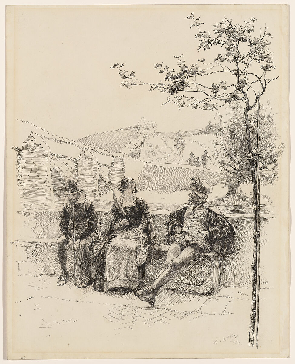 Abbey moved to England in 1878 to research and produce illustrations to historical verse for Harper's and settled there permanently in 1883. This drawing comes from a series that responds to "A Love Song" by the British seveenth-century poet George Wither. Two men sit beside a young woman on a bench near a river– with the downcast figure at left representing the narrator who bemoans love's inconstancy in the related text: