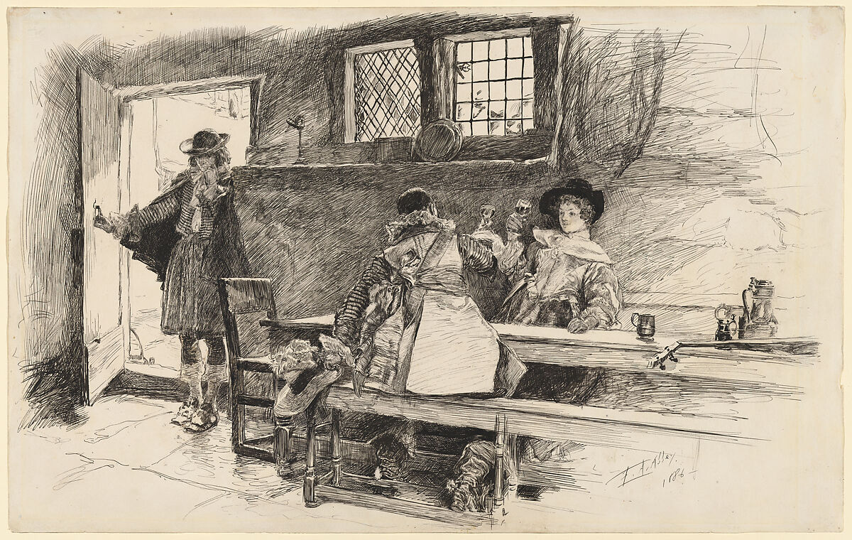 This is one of a series that Abbey drew for Harper's to illustrate the anonymous seventeenth century English poem "Phillada Flouts Me." In the verse, the narrator grows increasingly depressed as the young woman he desires ignores him. Here we see the young man entering a tavern where a more successful and sophisticated rival raises a glass. The related stanza reads: