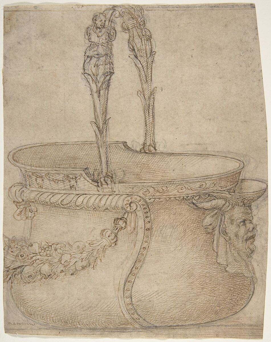 - Title: Design for a Bucket-Like Vessel with a Handle of Two Interlaced Captives, on a Body Adorned with a Scroll, Garland, and a Spout with a Satyr's Head