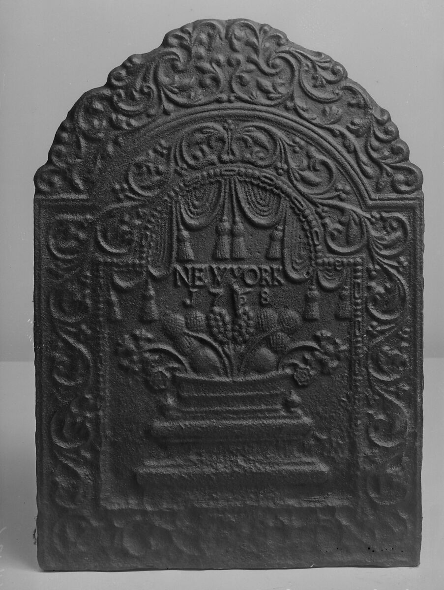 Iron firebacks were cast in molds carved from mahogany. This funereal example features a central image of a tombstone with mourning drapes and flowers.