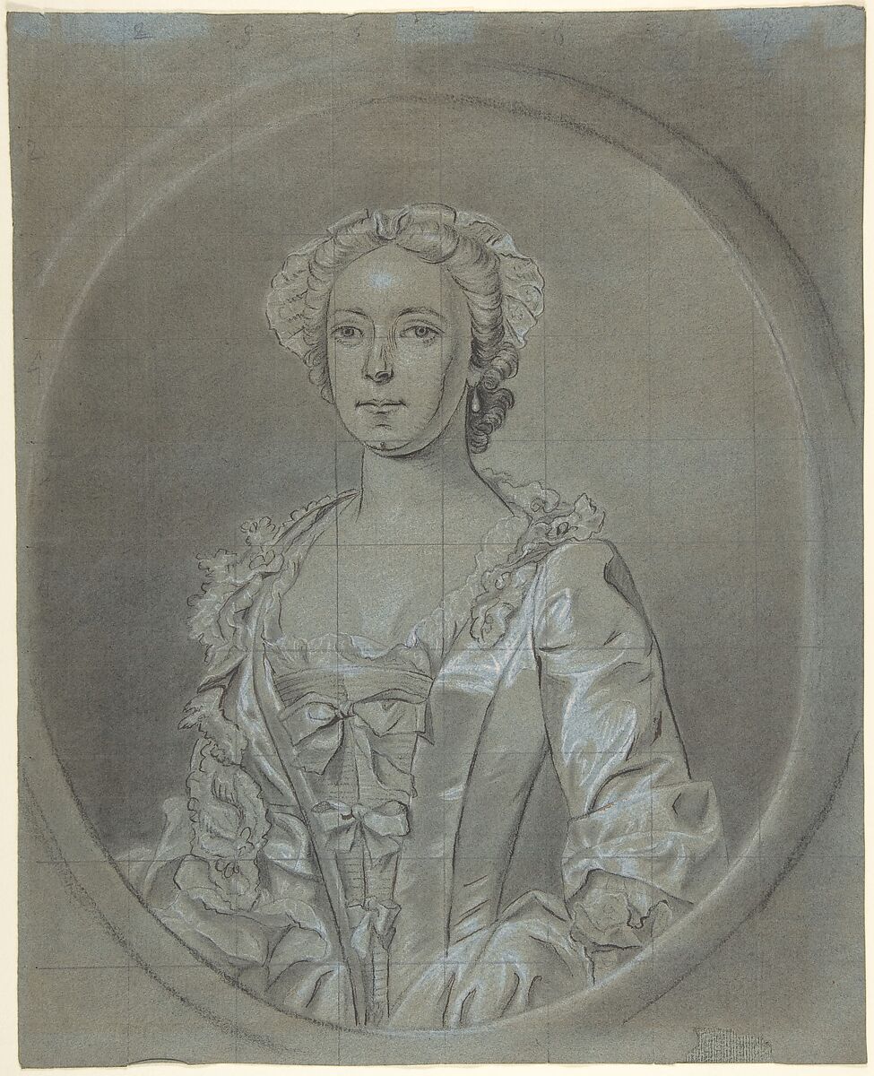 An assistant probably made this portrait study, but it demonstrates Van Aken's typical attention to texture. The satin gown with its bow-bedecked stomacher, the lace collar, the sleeves, and the cap have all been differentiated by black and white chalk and further defined with touches of brown ink. The design was then overlaid with a graphite grid to allow it to be transferred accurately onto canvas.