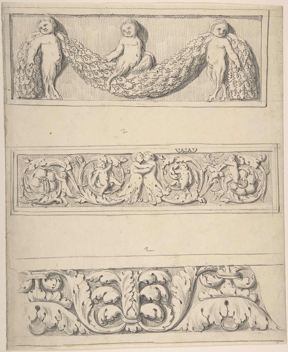 - Title: Three Frieze Designs with Young Satyrs, Leaves, Vines, and Putti