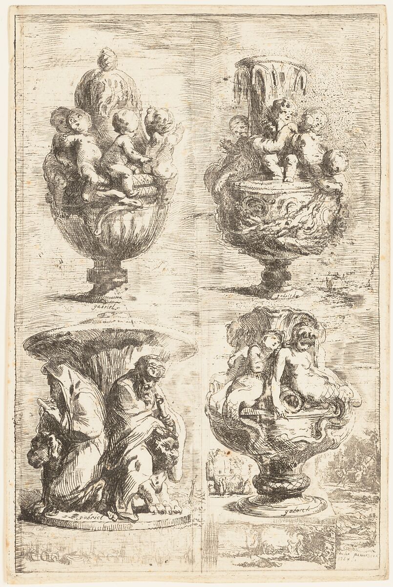 Each of the four vases bears Saint-Aubin’s signature "Gabriel" at the base, suggesting that he may have intended at some point to cut the plate into four pieces.