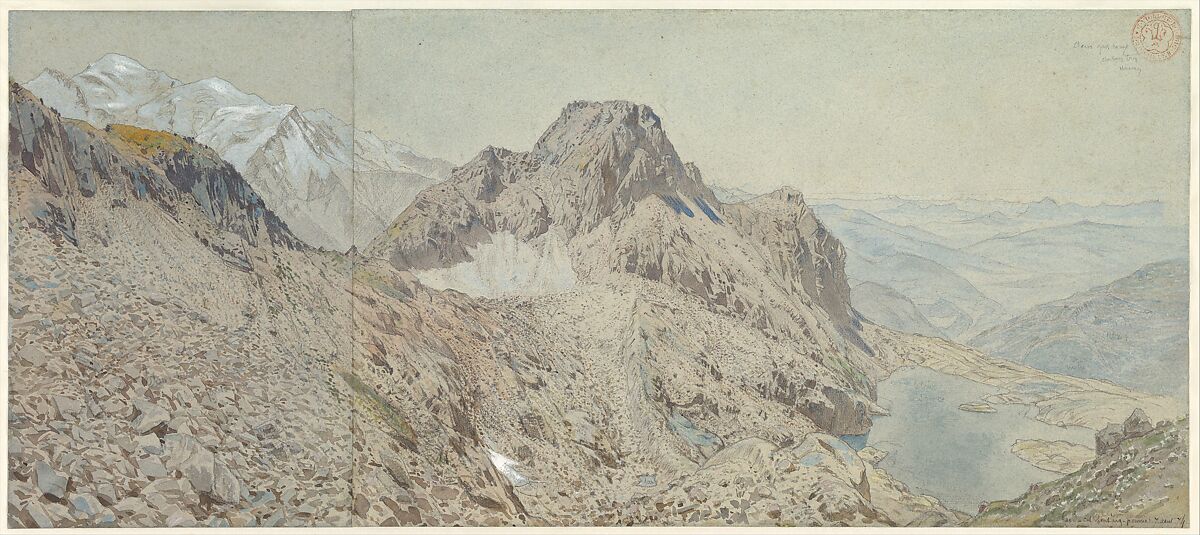 One of the nineteenth-century's most influential architects, Viollet-le-Duc, known especially for his restorations of France's greatest churches, was also a prolific author of theoretical writings, as well as a talented draftsman. In this spectacular mountain view he married an architect's understanding of structure and space to an artist's sense of color and line. The drawing dates from the end of Viollet-le-Duc's life, when he was working on a map of the Mont Blanc massif. The map was published in 1876 with a "study of its geodesic and geological construction, of its transformations, and of the old and modern state of its glaciers." Viollet-le-Duc's love for the mountains was born much earlier, however, in 1831, when he took a trip to the Auvergne in central France.