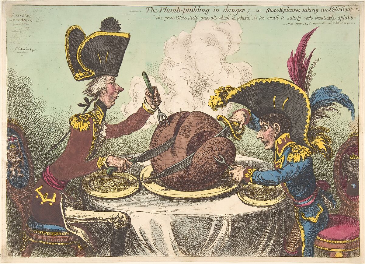 Napoleon Bonaparte, declared emperor of France in 1804, and the English statesman William Pitt sit across a dining table, each carving out a piece from a plum pudding in the shape of the world. The diminutive Napoleon, rising from his seat in order to reach the table, hungrily takes Europe while Pitt carves a large slice of ocean, illustrating the respective areas of power in the ongoing war between Britain and France.