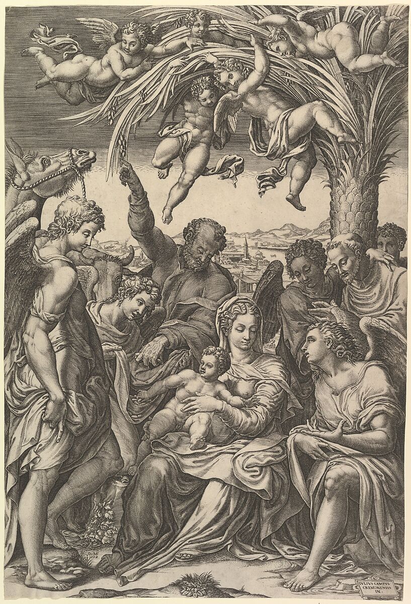 - Title: Rest on the Flight into Egypt; the Holy Family under a palm tree surrounded by angels, putti, and a male cleric or saint