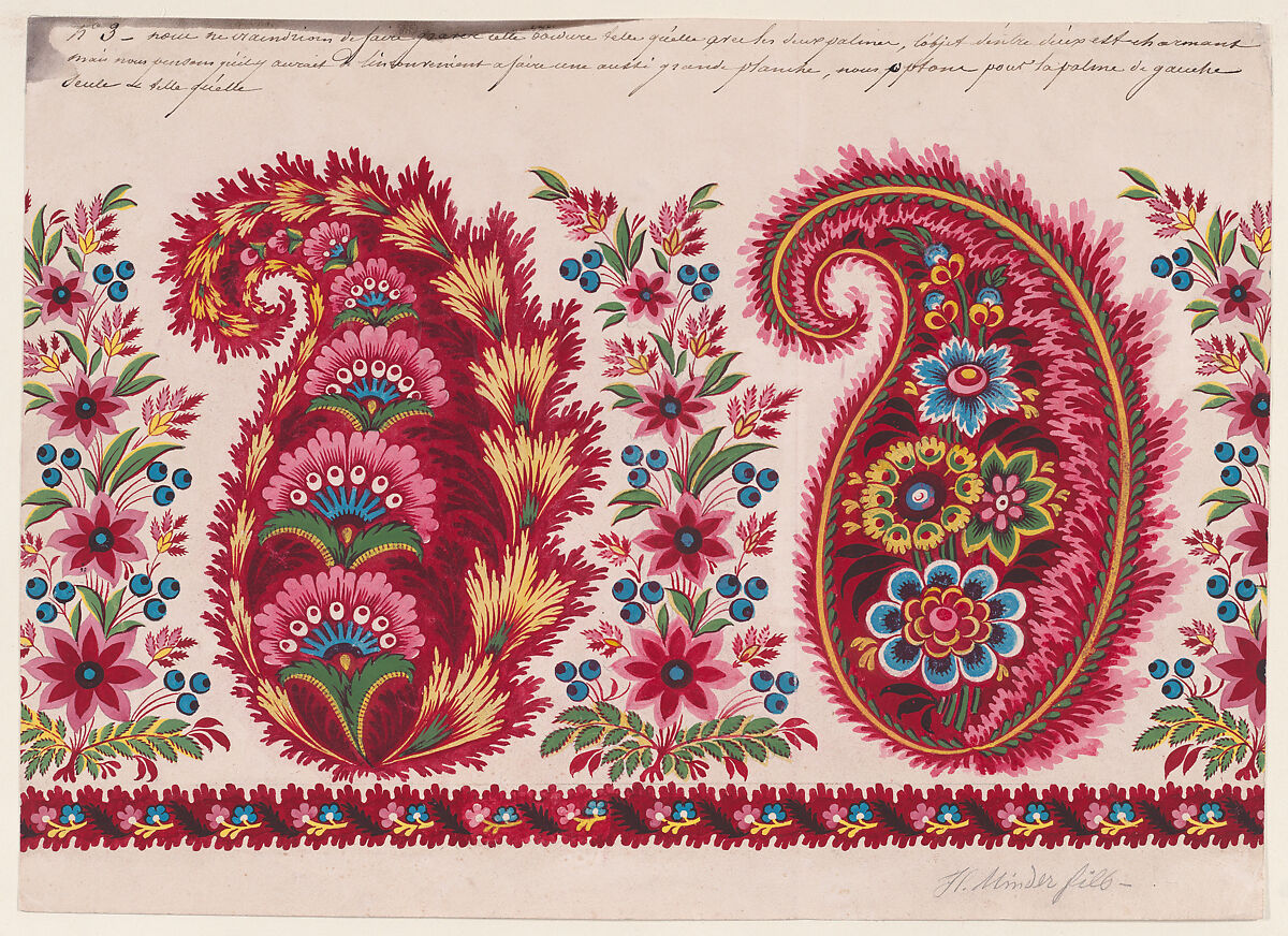 - Title: Textile Design with Paisley Motifs and Garlands of Berry Sprays and Stylized Flowers