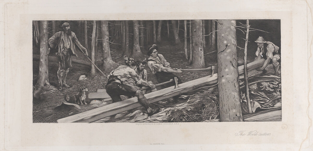 Part of the series titled "Modern Artists" that Virtue published 1880–82, this print is based on an 1874 watercolor shown by Herkomer the Exposition Universelle, Paris in 1878. A printed summary report by the United States Commissioners described the drawing as, "workmen turning the trunk of a tree they have felled...admirable in its action and drawing, and very pleasing in its clear gray tones." The costumes place the scene in Bavaria, the German state where Herkomer was born and returned as a young artist to find subjects.