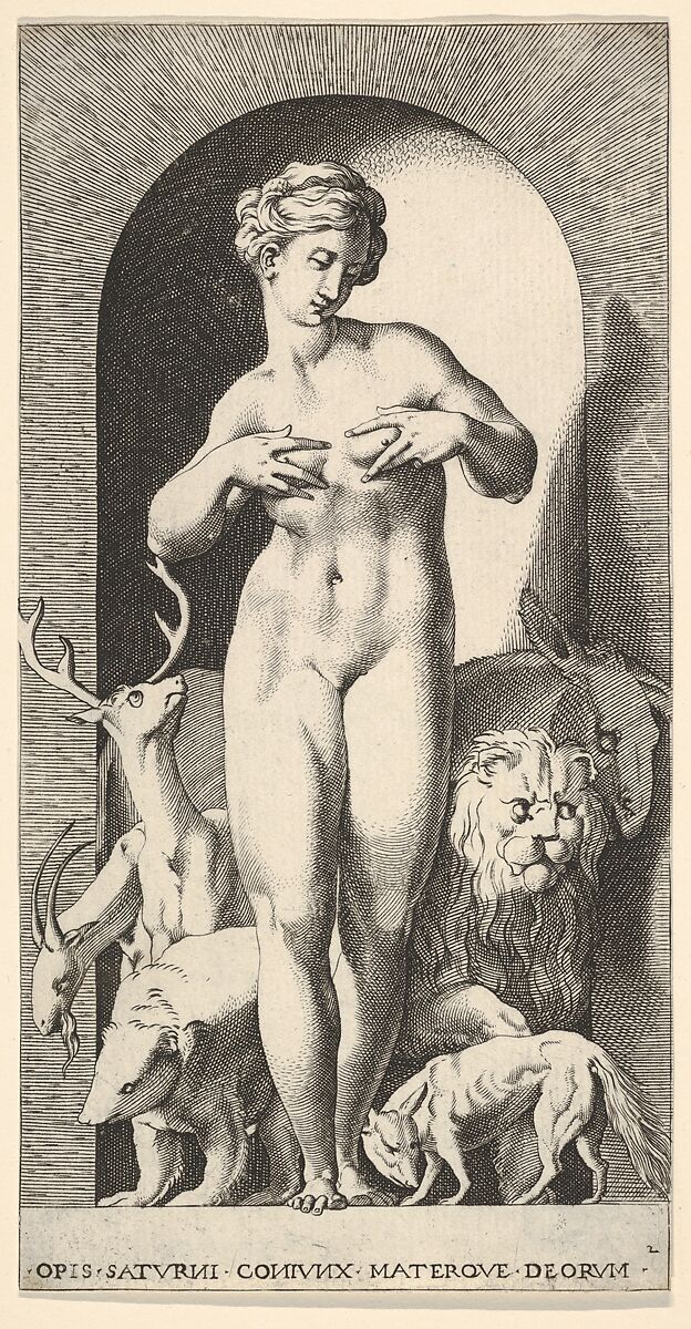 - Title: Plate 2: Ops standing in a niche with her hands at her breasts, looking to her left, with animals behind her, from "Mythological Gods and Goddesses"
