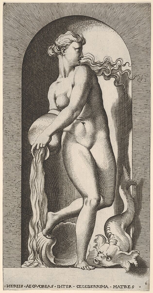 Plate 6: Thetis standing in a niche with a shell and sea creature, pouring water out of a vase, looking to her left, from "Mythological Gods and Goddesses"
