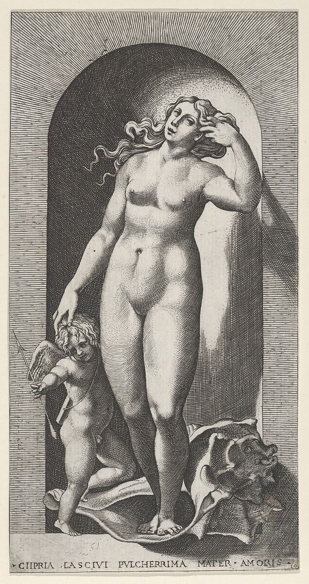 - Title: Plate 10: Venus in a niche, standing on a conch shell, with Cupid to her right, from "Mythological Gods and Goddesses"