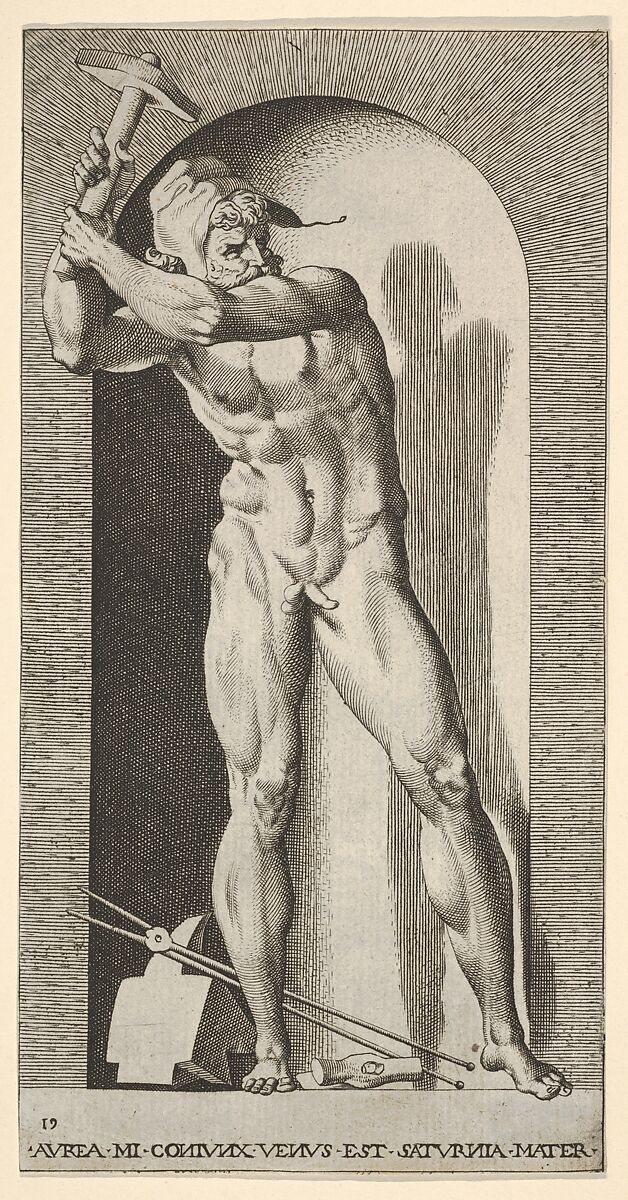 - Title: Plate 19: Vulcan standing in a niche swinging a hammer, with an anvil, hammer, and tongs at his feet, from "Mythological Gods and Goddesses"