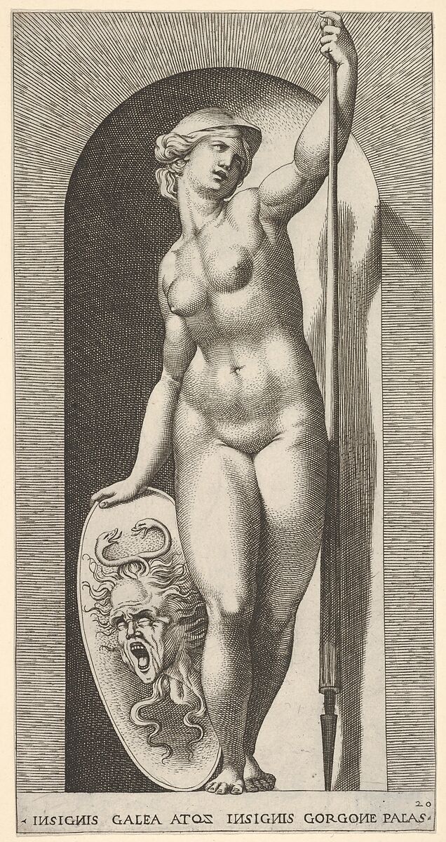 - Title: Plate 20: Pallas Athena holding a shield with Medusa's head in her right hand and a lance in her left hand, from "Mythological Gods and Goddesses"