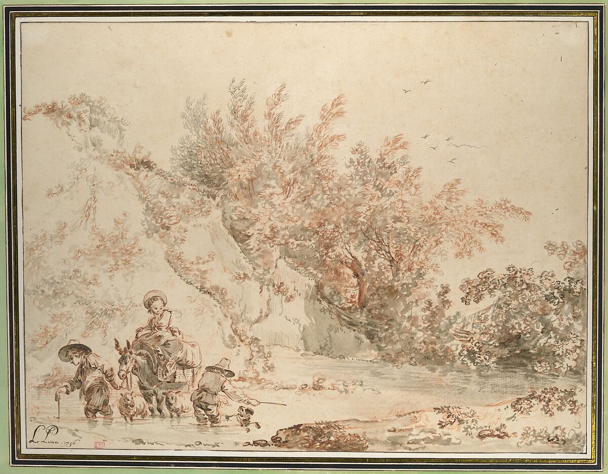 This previously unknown landscape drawing is among the earliest known works by Le Prince, made when he was still working closely with his teacher, François Boucher (1703-1770). It clearly displays the lineage of Boucher's particular conception of the pastoral, combining a strong interest in northern art with a Rococo sensibility, while at the same time anticipating the arabesque-based compositions and delicate use of wash that characterize Le Prince's mature landscapes.