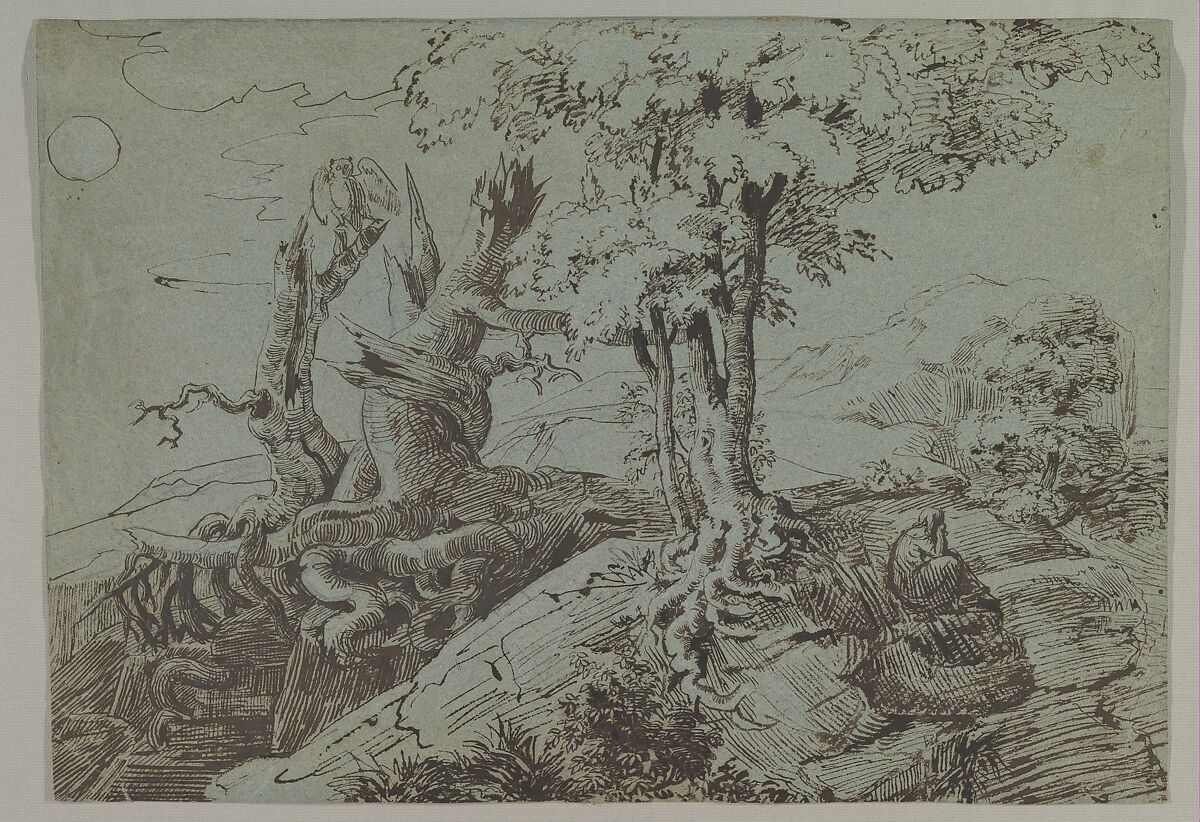 - Title: Rugged Moonlit Landscape with a Woman Seated by Gnarled Tree Roots, and an Owl