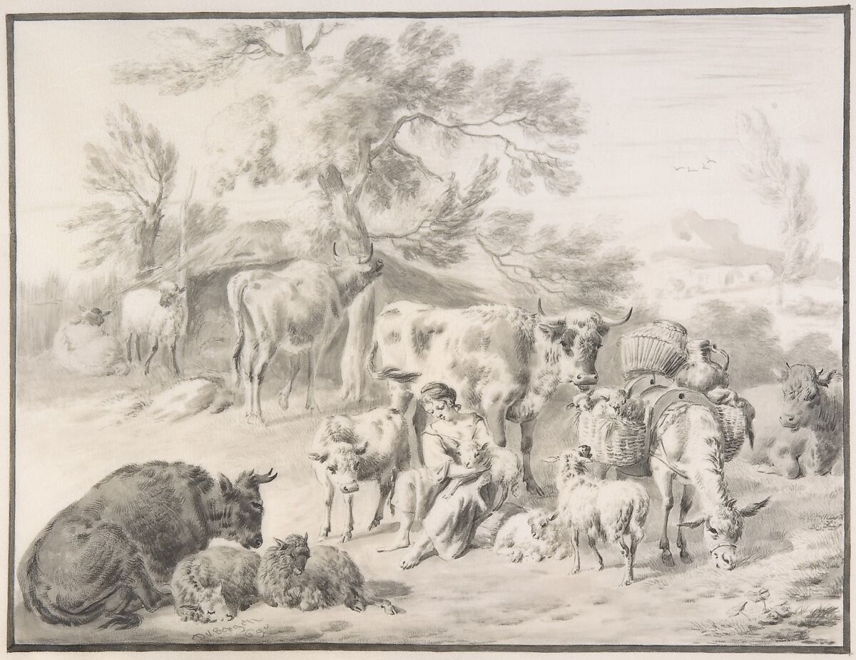 - Title: A Herdswoman Seated Amongst Her Animals, with a Lamb in Her Arms