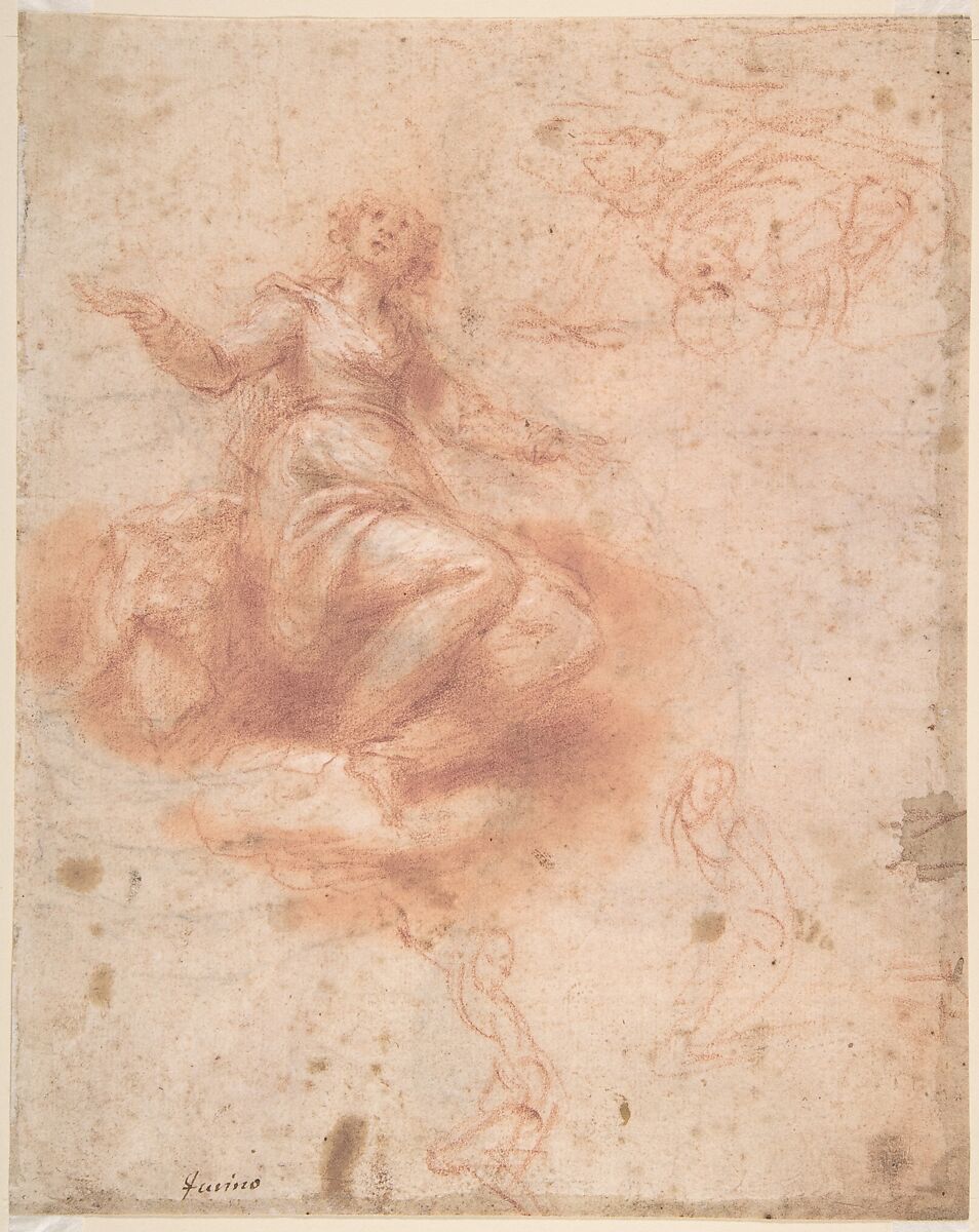 Drawn in red chalk, with white gouache highlights, the sheet portrays on the recto a large study of a young woman seated on clouds, and around it, three much smaller summary figural sketches. The verso portrays a fairly finished study of a pensive old, bearded man in a nearly half-length composition (the bottom border of the sheet is cropped), and a large detail study of a male left hand on the upper right. The recto is inscribed in pen and brown ink toward the bottom left: "furino," which is more likely a signature by the artist. Less likely, this inscription represents an attribution by a mid 17th century collector, which turns out to be entirely correct.