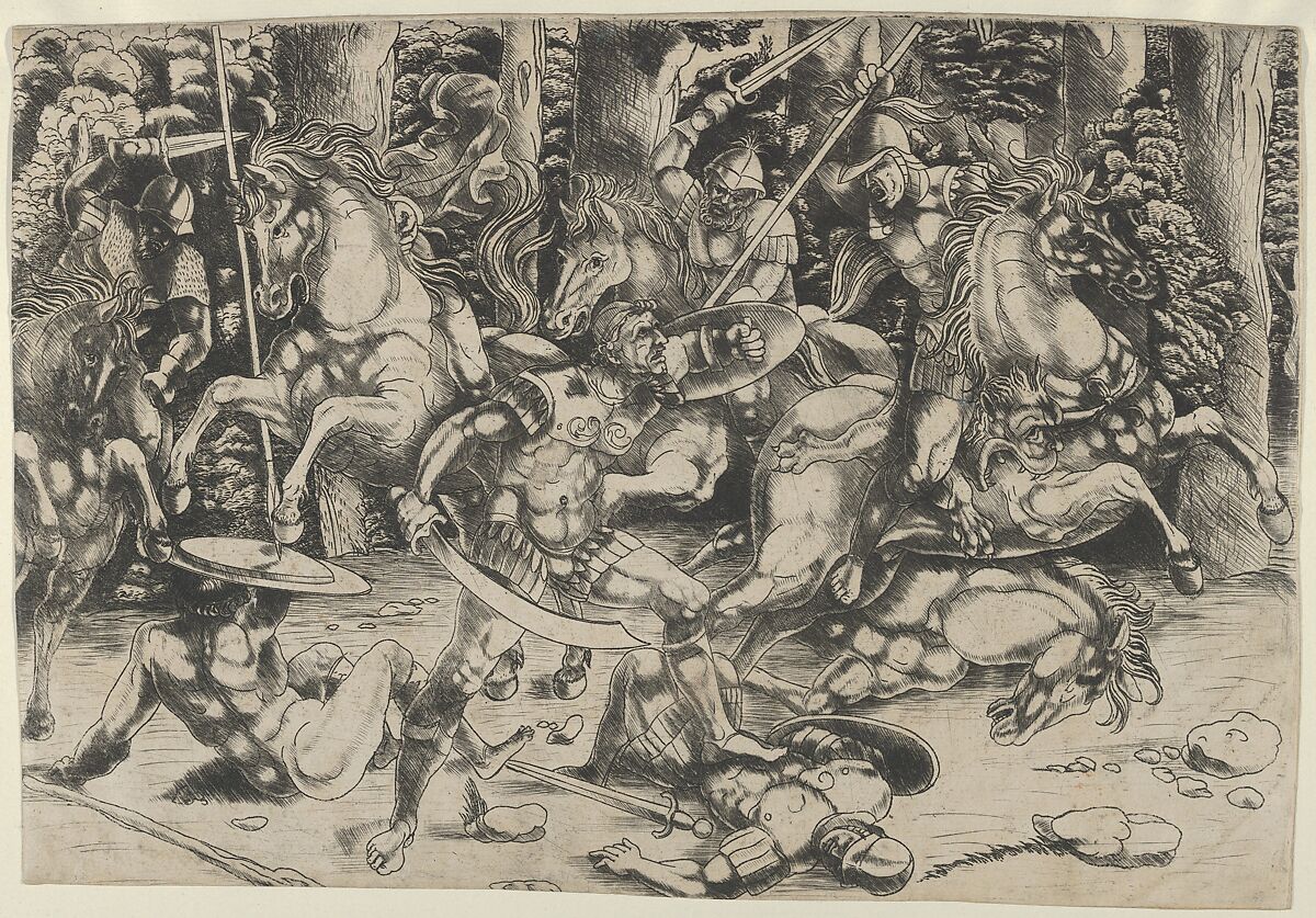Little is known about this idiosyncratic engraver, whose name derives from the date on one of his prints. It is possible that he can be identified with Agostino Busi, known as Il Bambaia, since several of his architectural prints derive from a sketchbook attributed to that Lombard sculptor, active in Milan in the early sixteenth century. The most distinctive feature of his style, which is close in many respects to that of Mantegna, is the presence of burr-the bits of metal that form on either side of an incision into a metal plate. When not burnished away, this burr absorbs the ink and prints a rich, velvety black, a feature very evident throughout this battle scene.