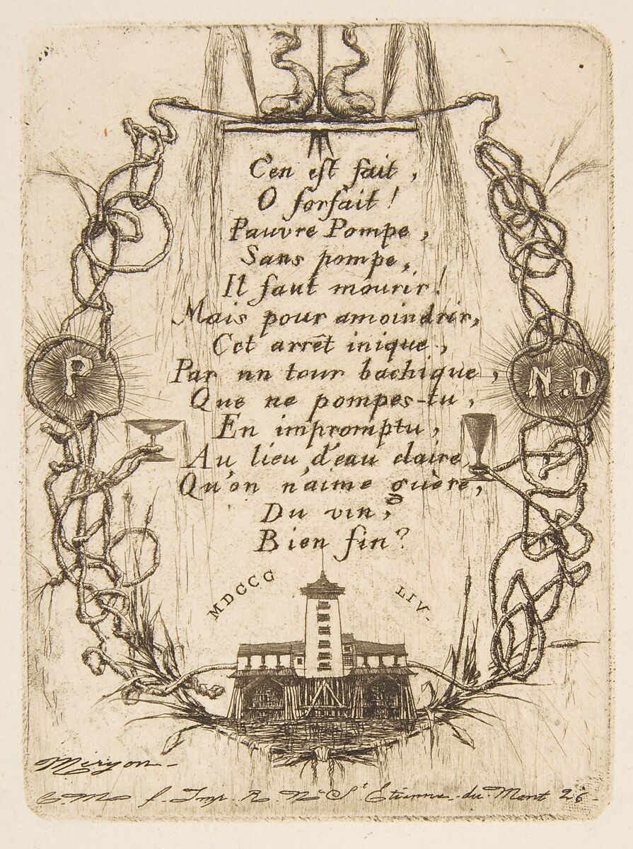 Meryon occasionally composed verse to accompany his prints. In this case, he designed a separate plate for his poem about the Notre-Dame water pump. In translation, the tongue-in-cheek text reads: