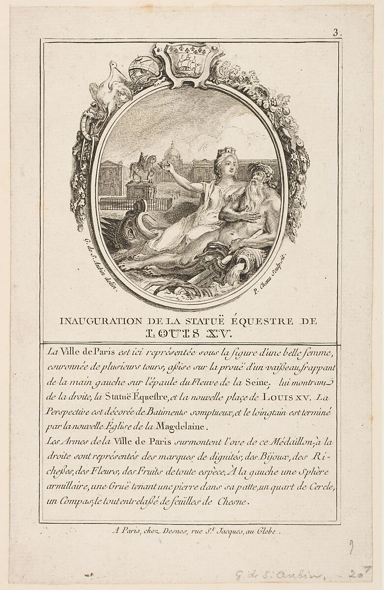 For a publication celebrating royal architectural patronage, Saint-Aubin represented the sculpture’s inauguration in allegorical form with the Seine and the city of Paris welcoming the new jewel in the city’s crown.