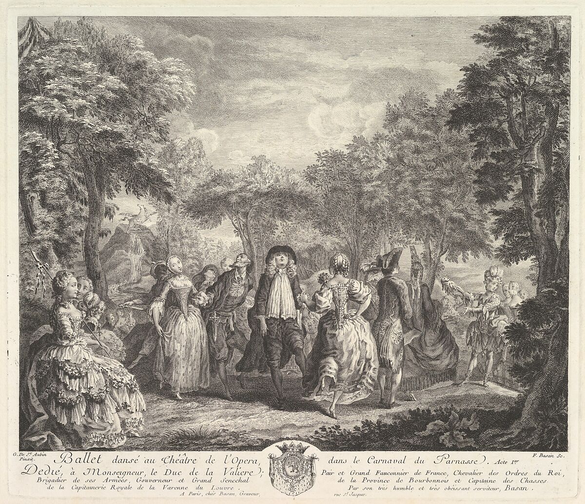 The Carnival of Parnassus, a ballet by the composer Jean-Joseph Cassanéa de Mondonville (1711–1772) premiered in Paris in 1749. Saint-Aubin was a great fan of the theater, often depicting specific moments from performances he had seen.