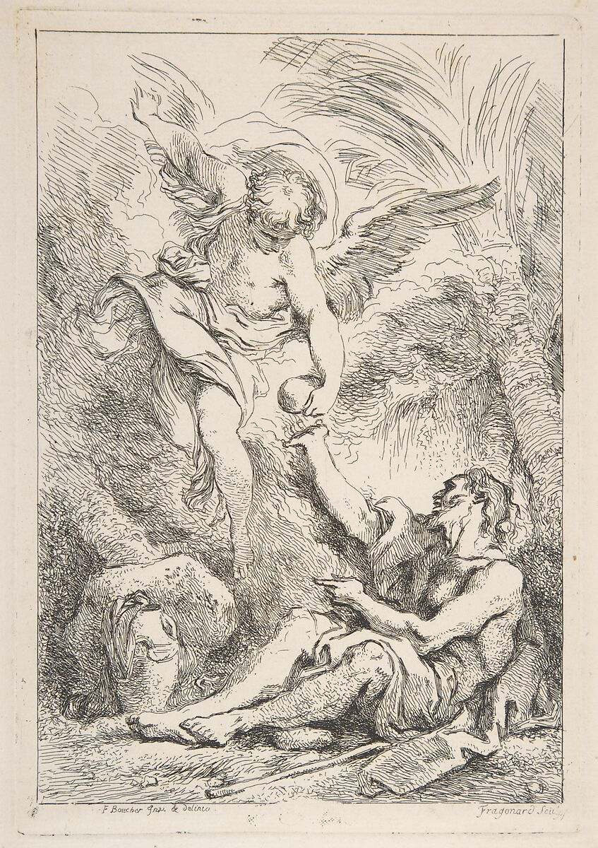 In this, his first print, Fragonard demonstrates a ready facility with the etching needle, producing a composition based on a chalk drawing by his master, François Boucher. Using a variety of short and staccato lines, Fragonard evokes the rough textures of the desert, where a saint seated on the rocky ground accepts a gift from an angel. The drawing by Boucher that was his model survives today in the National Gallery of Canada (inv.6888).