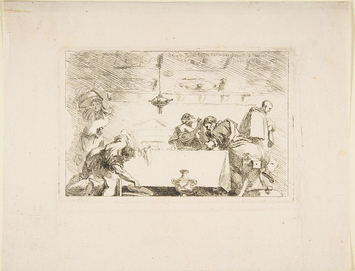 This etching is from a group of sixteen made by Fragonard in Paris around 1763-64, based on black chalk drawings he had made in Italy a few years earlier for his friend and patron, the abbé de Saint-Non. Of the sixteen, ten were based on Venetian models, including this one after Sebastiano Ricci (Italian, 1659-1734). Ricci's original canvas, made for the church of Corpus Domini does not survive, so we cannot be sure to what degree Fragonard may have altered or simplified his canvas. According to contemporary guidebooks, Ricci's painting was unusual in that it depicted the moment after the Last Supper had concluded, when some disciples remained at the table and servants were clearing away dishes and linens.