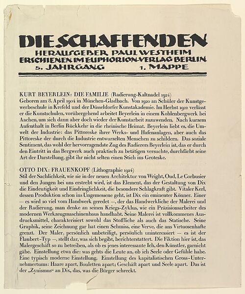 - Title: Text sheet from Die Shaffenden