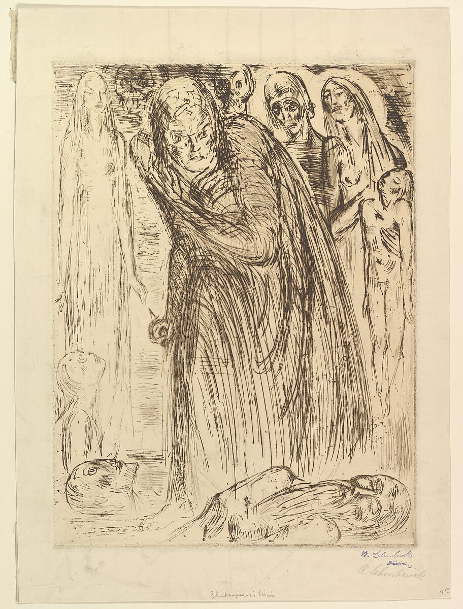 Known best as a sculptor, Lehmbruck also made etchings and drypoints in his last decade. This example belongs to a series he devoted to Lady Macbeth, a fearsome figure in Shakespeare's play who encourages her husband to murder King Duncan to attain the throne, and is herself eventually consumed by guilt. Here, she clutches a dagger and is surrounded by corpses and wraiths. The elderly figure in the right foreground likely represents Duncan, while the group at right may be Banquo's family. Traumatized by his service in an army hospital during the First World War, Lehmbruck created this print a year before committing suicide.