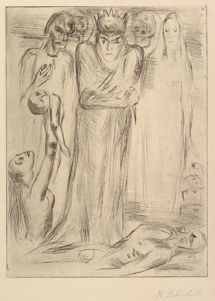 Known best as a sculptor, Lehmbruck also made etchings and drypoints in his last decade. This example belongs to a series he devoted to Lady Macbeth, a fearsome figure in Shakespeare's play who encourages her husband to murder King Duncan as a means to the throne, and is herself eventually consumed by guilt. Here, she wears a crown, clutches a dagger and is surrounded by corpses and wraiths, including a young mother who holds a child up like a totem. Lembruck was traumatized by his service in an army hospital during the First World War and created this print a year before committing suicide.