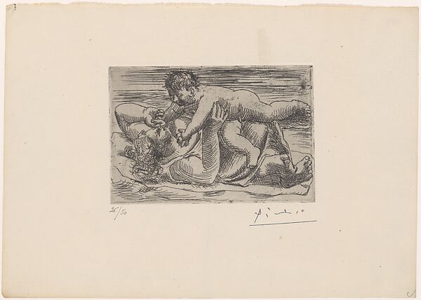 The birth of Picasso's first son, Paulo, in February 1921 inspired this tender etching of a mother and child. Their rotund bodies are typical of his monumental heads and nudes of this period. The pose of the playful child is very close to Poussin's depiction of Cupid wrestling a baby satyr in his painting Venus and Mercury (ca. 1627-29, Dulwich Picture Gallery), which Picasso likely knew from a reproduction.
