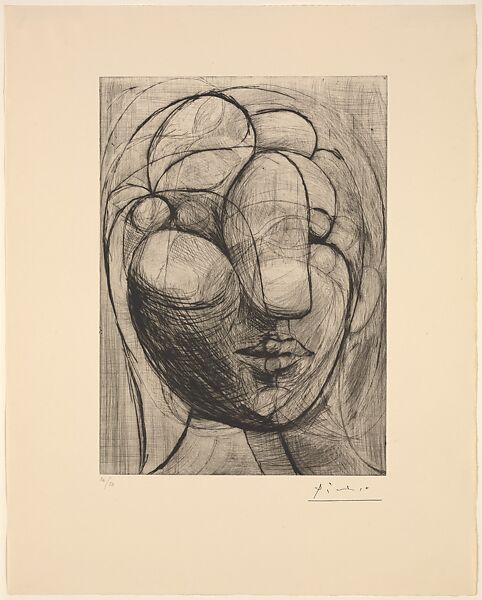 The bulbous shapes in this drypoint derive from the monumental plaster heads of Marie-Thérèse Walter that Picasso produced in Boisgeloup during the summer of 1931. Interested in transforming a three-dimensional sculpture into a flat print, he obsessively worked and reworked the print in twenty states. This impression, pulled from the final state, reveals evidence of pentimenti, or drawing from earlier states.