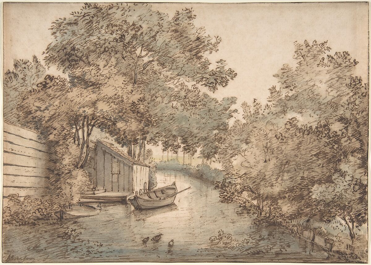In the tranquil waters of a canal framed by wildly vegetated banks, two little boats are moored near a shed—a record of the Dutch rural landscape. For Van Borssom, a prolific draftsman, painter, and printmaker, the local countryside formed a prime source of inspiration. The vigorous pen and ink lines with which foliage and shrubbery are rendered show the influence of Rembrandt’s renowned landscape etchings. The cool green and blue watercolors, typical of Van Borssom’s palette, complement the expressive penwork and reinforce the stillness of the scene.