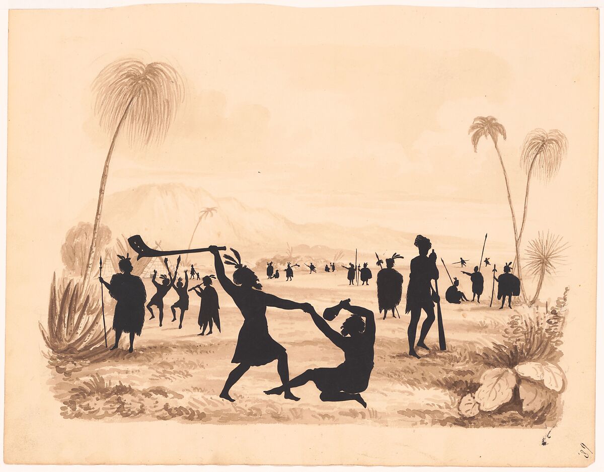 This unusual picture shows the complex compositions that Edouart’s silhouette cutting could achieve. The work features various natives, wearing animal skins and headdresses and holding arrows, spears, and flutes, as well as a mother and child, in a vast, tropical landscape replete with huts in the background. The central violent scene shows two men engaged in a brutal battle with weapons. While it is unknown whether Edouart ever visited such an island, records verify that much of his life was spent traveling the Anglo-European world.