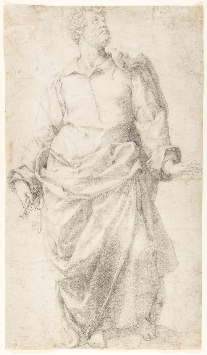 This sculptural, carefully rendered study of the standing figure of Saint Peter (identified by the keys in his hand at left) is a rare early drawing by Daniele da Volterra, datable to the mid-1540s, when the artist had renounced the relatively provincial vocabulary of his early training in Volterra and Siena in favor of the bold, grand manner of the Roman school, then dominated by the aging Michelangelo and the pupils of Raphael (who had died in 1520).