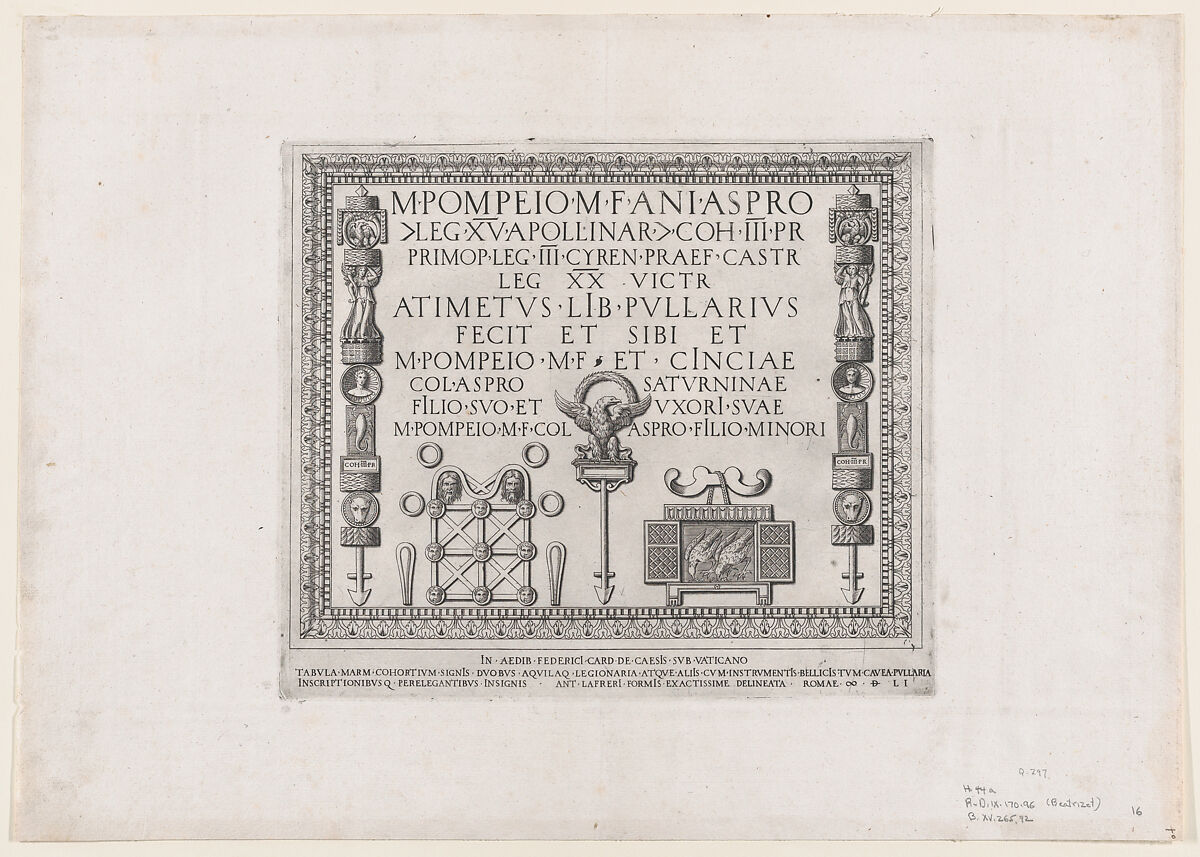 - Title: A Marble Plaque with Military Insignia, from "Speculum Romanae Magnificentiae"