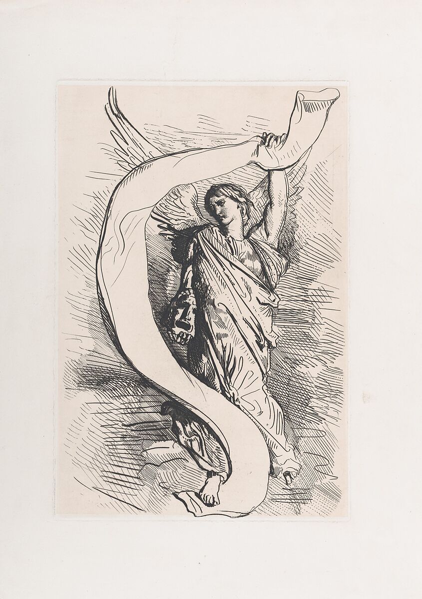 In 1844 Eugène Piot commissioned the young Chassériau to prepare fifteen illustrations to Shakespeare's Othello. Inspired by a series of ground-breaking Hamlet lithographs that Delacroix had created one year earlier, the younger artist opted for the more linear technique of etching. His expressive conception of form had been learned in Ingres's studio then developed under Delacroix. In the series, key exchanges offer a compressed summary of much of the play, with a final cluster devoted to the tragic conclusion. This frontispiece, centered on a figure resembling the tragic muse Melpomene, was added when the series was reissued in the Gazette des Beaux-Arts in 1900.