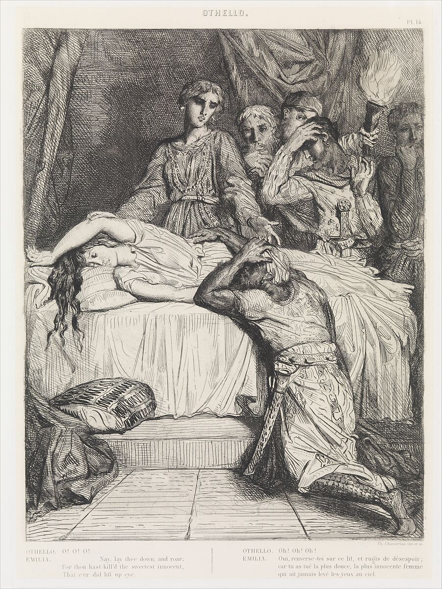 After Delacroix’s successful Hamlet lithographs appeared in 1843, Chassériau responded with a series of etchings devoted to Shakespeare’s Othello. This example encapsulates the play’s climax in act 5, in which the title character is undone by his tragic error concerning his wife, Desdemona. Having smothered her, he now kneels despairingly by the bed as her attendant Emilia reveals that "honest Iago," who told Othello she had been unfaithful, is a jealous manipulator: