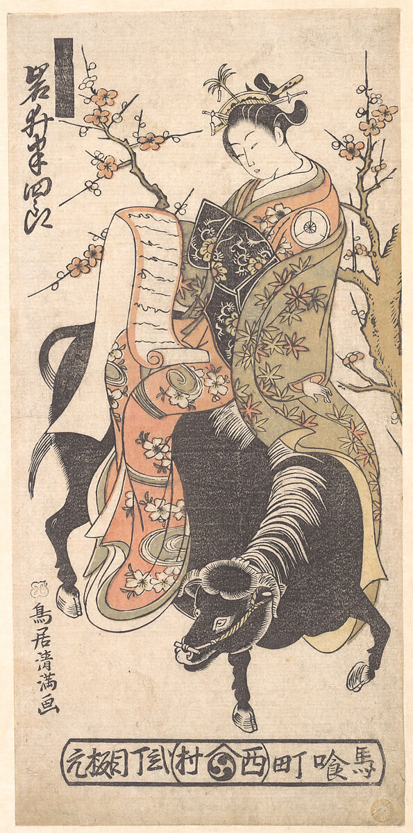 - Title: The Actor Iwai Hanshiro as a Courtesan Reading a Love Letter while Mounted on a Black Ox