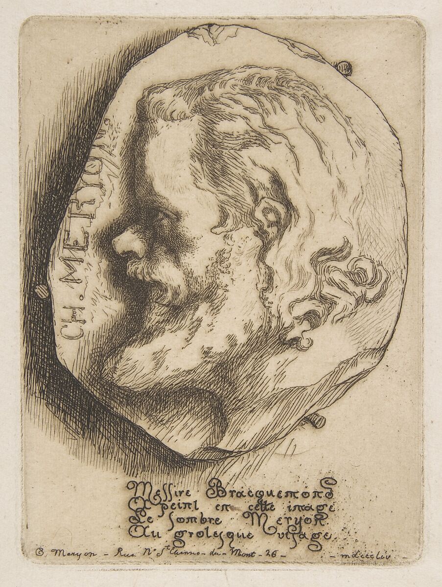 Bracquemond's second portrait of Meryon clearly indicated the subject's important position within the history of etching. The work drew upon the artistic tradition of medallion portraiture (17.190.449; 49.20.4), typically used to represent subjects of noble or elite status, to symbolically commemorate the elder printmaker. A verse inscribed at bottom center in this state of the print—describing "the grotesque face of the somber Meryon—paid further tribute to the artist, who often included poetic lines of his own composition on some states of his prints.