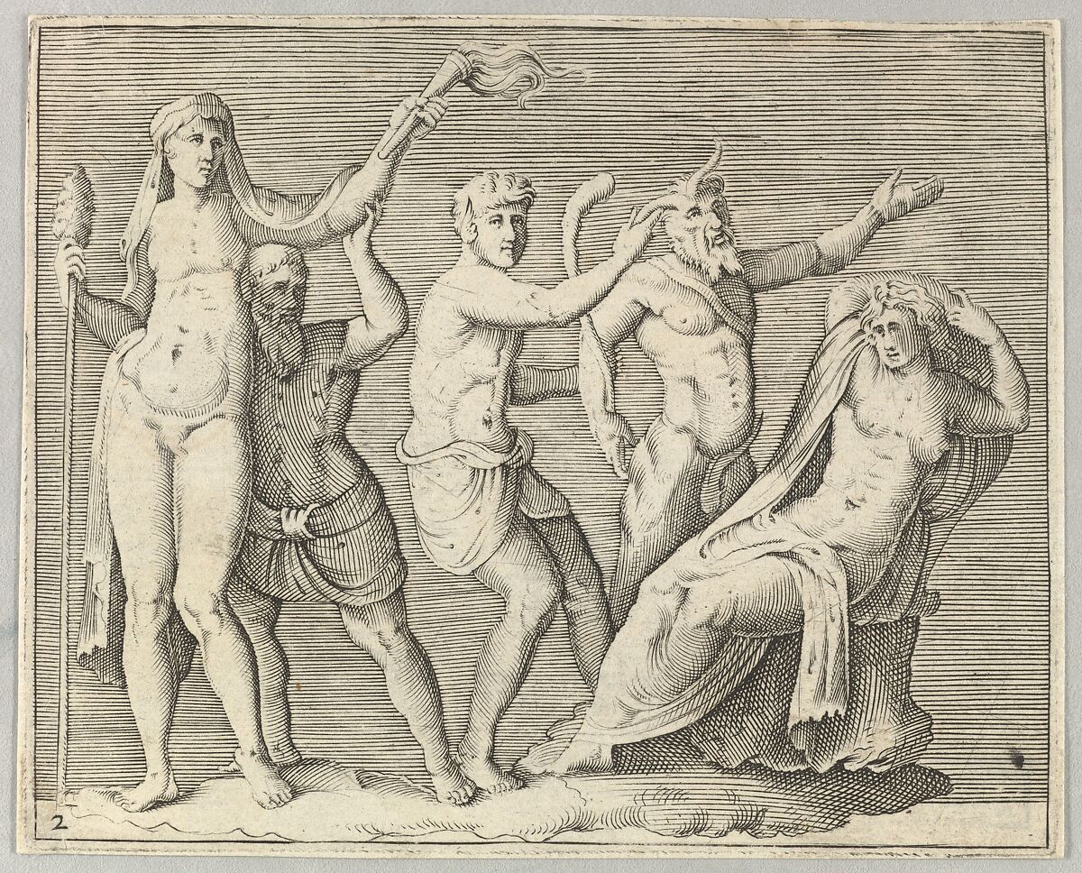 - Title: Two Figures, a Faun, and a Satyr approach a Recliniing Woman, from "Ex Antiquis Cameorum et Gemmae Delineata/ Liber Secundus/et ab Enea Vico Parmen Incis"