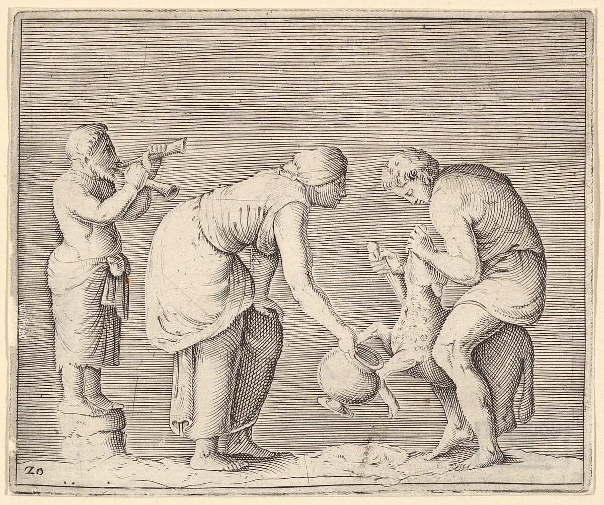 - Title: A Woman Collecting Blood from a Sheep, from "Ex Antiquis Cameorum et Gemmae Delineata/ Liber Secundus/et ab Enea Vico Parmen Incis"