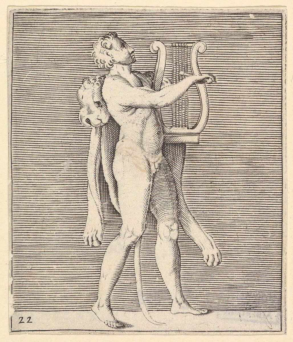 - Title: Hercules playing a lyre, a lionskin draped over his shoulder, from "Ex Antiquis Cameorum et Gemmae Delineata/ Liber Secundus/et ab Enea Vico Parmen Incis"