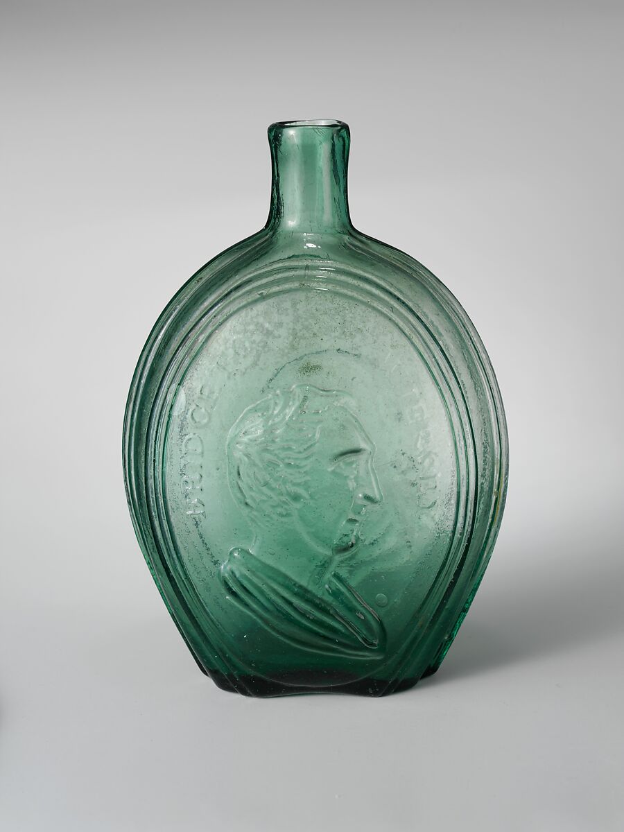 On the front of this flask is a profile portrait bust of George Washington in the classical style. On the reverse is a portrait bust of Zachary Taylor, also in the classical style.