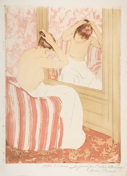 In 1891, Cassatt exhibited a set of ten color prints at the Galerie Durand-Ruel, Paris. All depict women engaged in everyday activities, with four using mirrors to extend and complicate the pictorial space. This intimate scene echoes woodcuts by Kitagawa Utamaro (1753–1806) showing courtesans at their toilette, examples of which the artist owned and admired. Here, a half-dressed woman sits before a looking glass and arranges her hair as she gazes down at her lap. Cassatt took the print through five states, using drypoint lines to establish the figure, then applying aquatint to build tone and pattern, and finally printing the plates with colored inks.