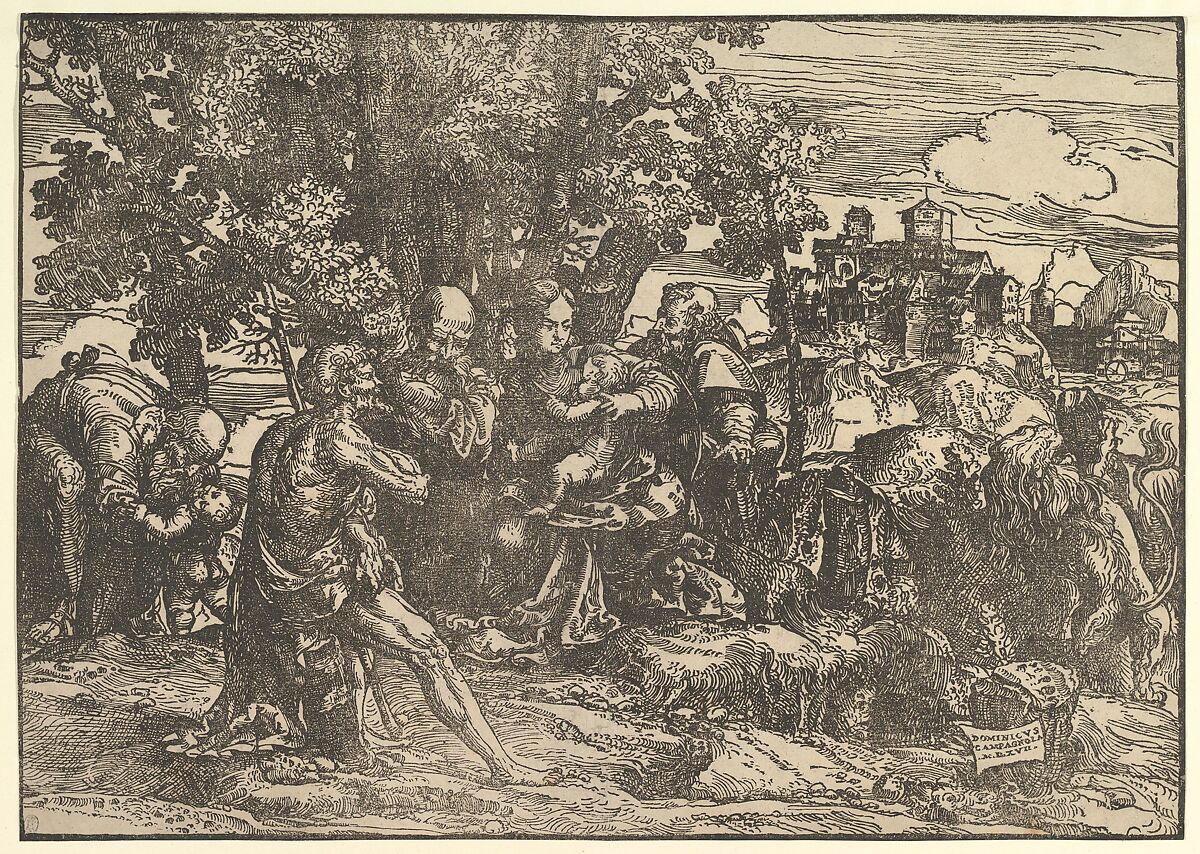 - Title: Mary seated beneath trees with baby, flanked by Joseph at left and St. Jerome at right; St. John the Baptist seated in the foreground holding a cross; a man stooping to pick up a child at left; a lion seen from behind at right; a town in the background