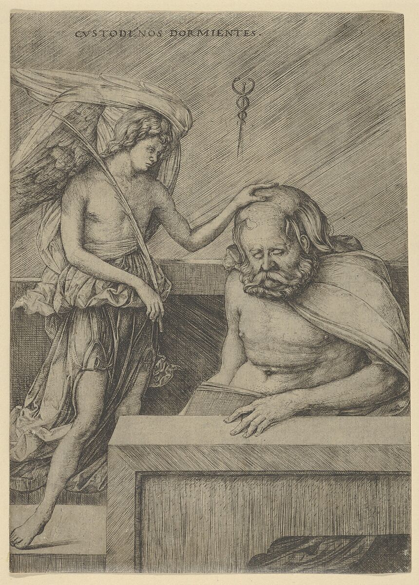 The Guardian Angel: an angel at left placing his hand on the head of a sleeping seated man